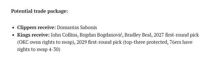 国王队得到:约翰-科林斯、博格丹-博格达诺维奇、比尔、2027年首轮签(雷霆队拥有互换权)、2029年首轮签(前三顺位保护,76人队拥有4-30顺位互换权)